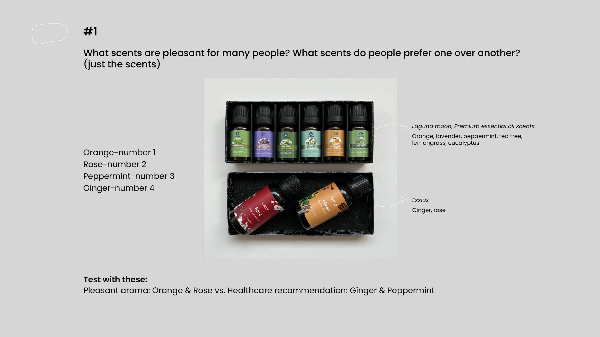 For this study, 17 people participated. I questioned participants individually and analyzed how many people prefer certain scents more than others. Results showed that people prefer non-medical scents. For instance, tea-tree lemongrass had chemical/medical scents that were unpleasant to many. However, this study was not entirely unbiased since picking the aromas is subjective; each individual’s preference differs. Nevertheless, the majority voted for orange, peppermint, rose, and ginger scents from the fragrances above.