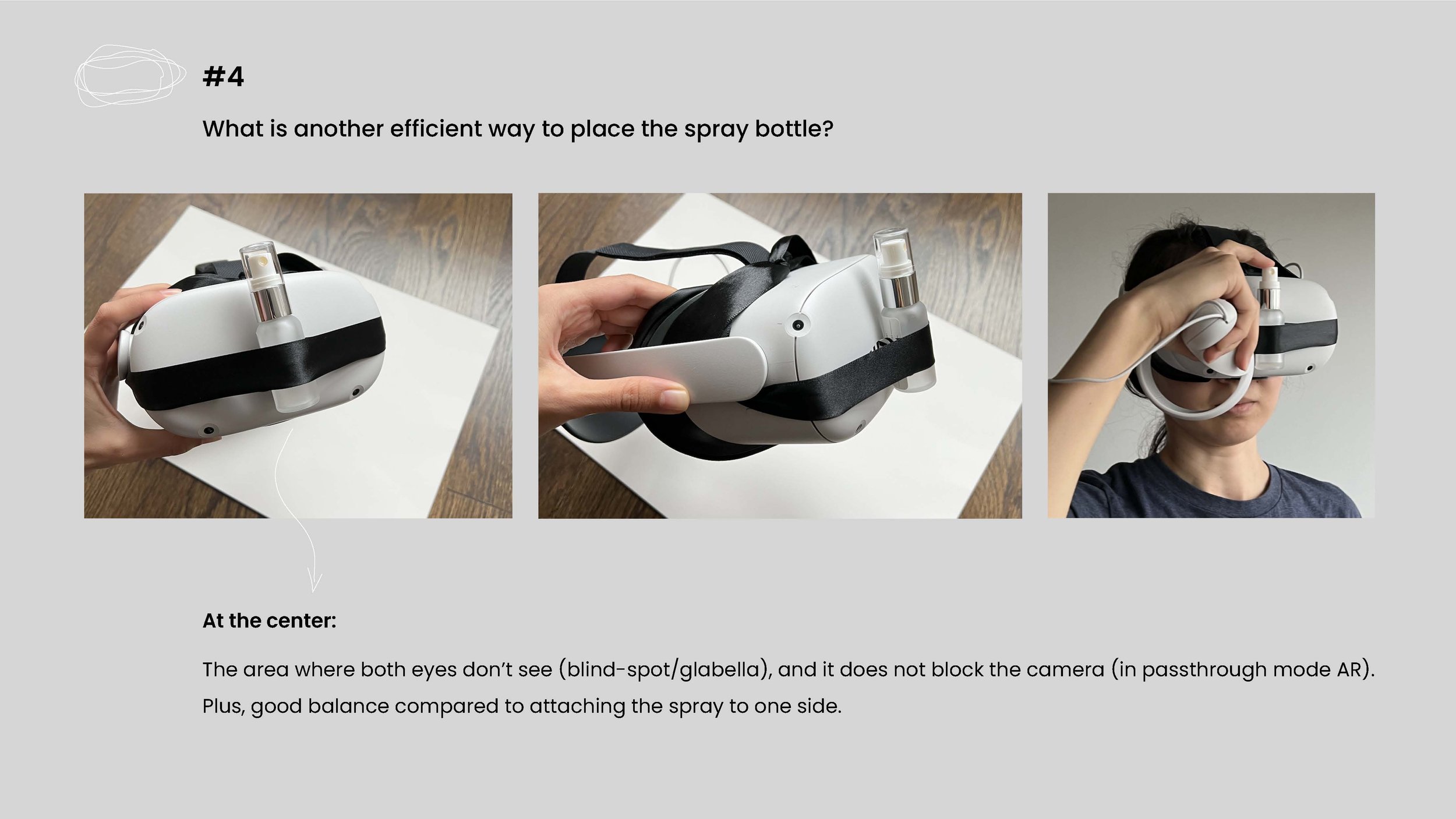 I explored other options to attach the spray to the headset on day 4 of prototyping. One option was to attach the spray in front and at the center of the headset, the area where both eyes don’t see, blind-spot/glabella, and it does not block the camera in passthrough AR mode. Plus, it was more balanced than attaching the spray to one side. However, this was only a spray bottle, it’s challenging to attach it to the front if I make it an automatic spray because there would be more Arduino components next to the spray, and it blocks the camera if placed in front. So, putting it at the top of the headset was a more suitable solution.