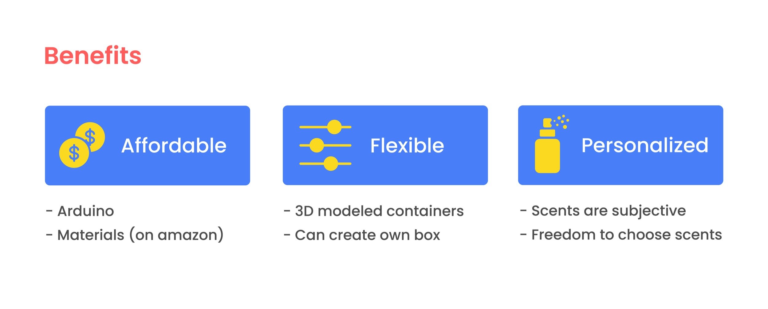 I wanted to know how to spray scent automatically with an Arduino. I used a super starter Arduino kit uno R3, and it had all the basic components. Since it was my first time learning/using an Arduino, I followed tutorials on youtube to create my automatic scent dispenser. In this prototype, I used one servo motor that came in the kit, and it did not have enough strength to push down the spray bottle cap. From this prototype, I learned the basic mechanics of using Arduino.