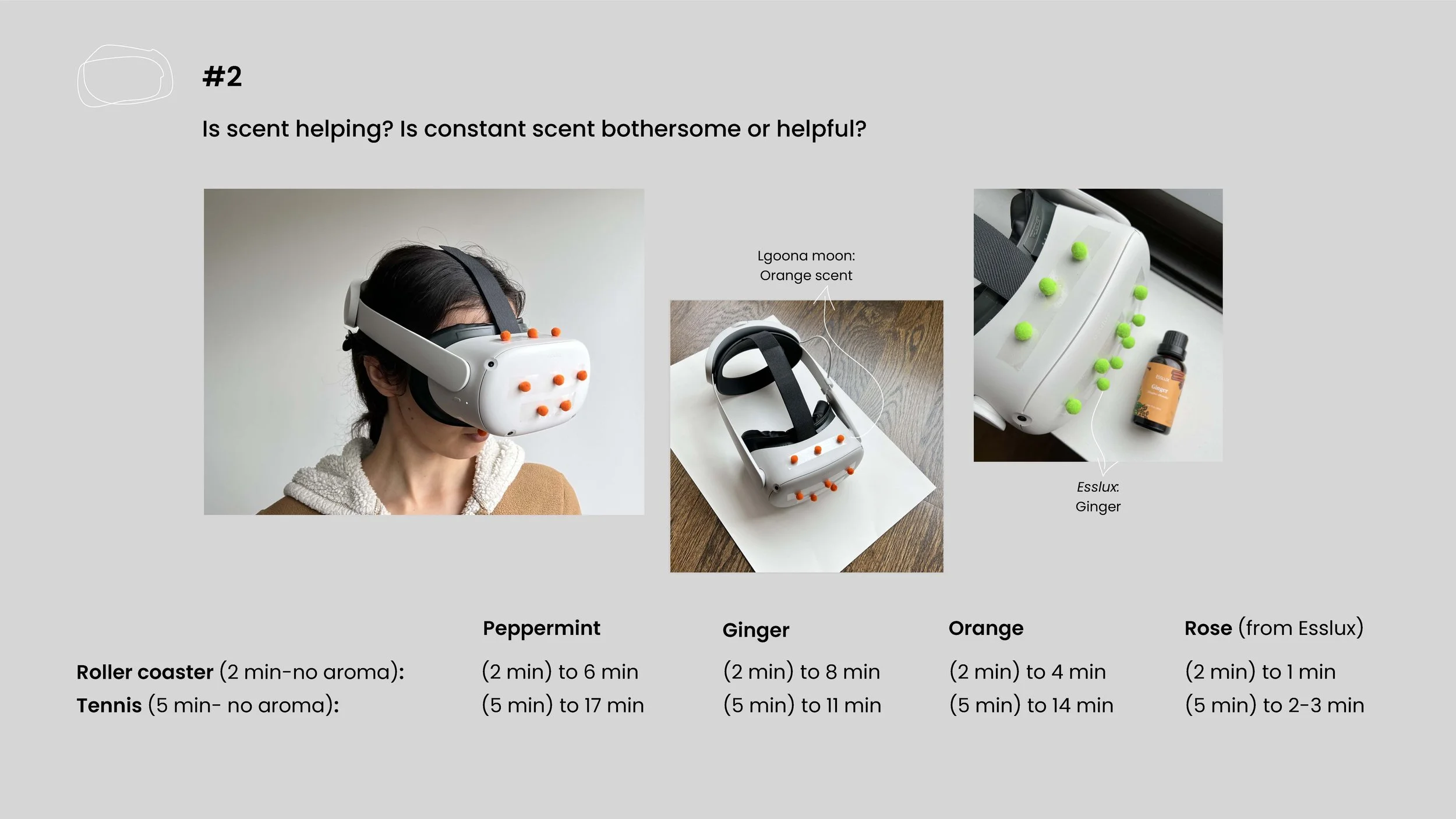I lightly sprayed oil scents (orange, rose, ginger, peppermint) onto tiny wool balls and stuck them to the headset so it did not have a heavy smell; each scent was tested separately. However, it is essential to note that users were exposed to constant scent and the level of discomfort and time differs depending on what kind of scent (brand) is used.