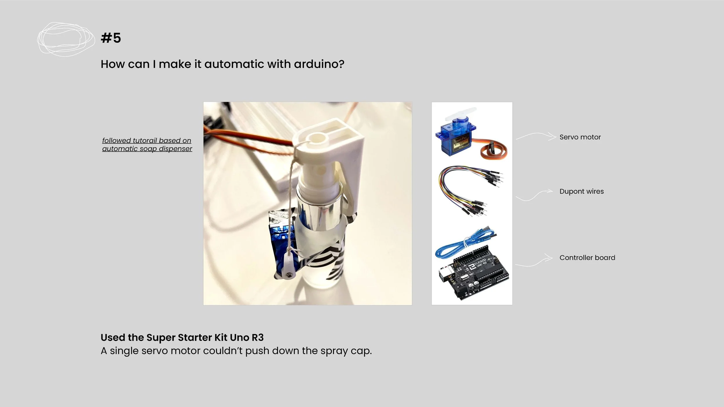 I wanted to know how to spray scent automatically with an Arduino. I used a super starter Arduino kit uno R3, and it had all the basic components. Since it was my first time learning/using an Arduino, I followed tutorials on youtube to create my automatic scent dispenser. In this prototype, I used one servo motor that came in the kit, and it did not have enough strength to push down the spray bottle cap. From this prototype, I learned the basic mechanics of using Arduino.